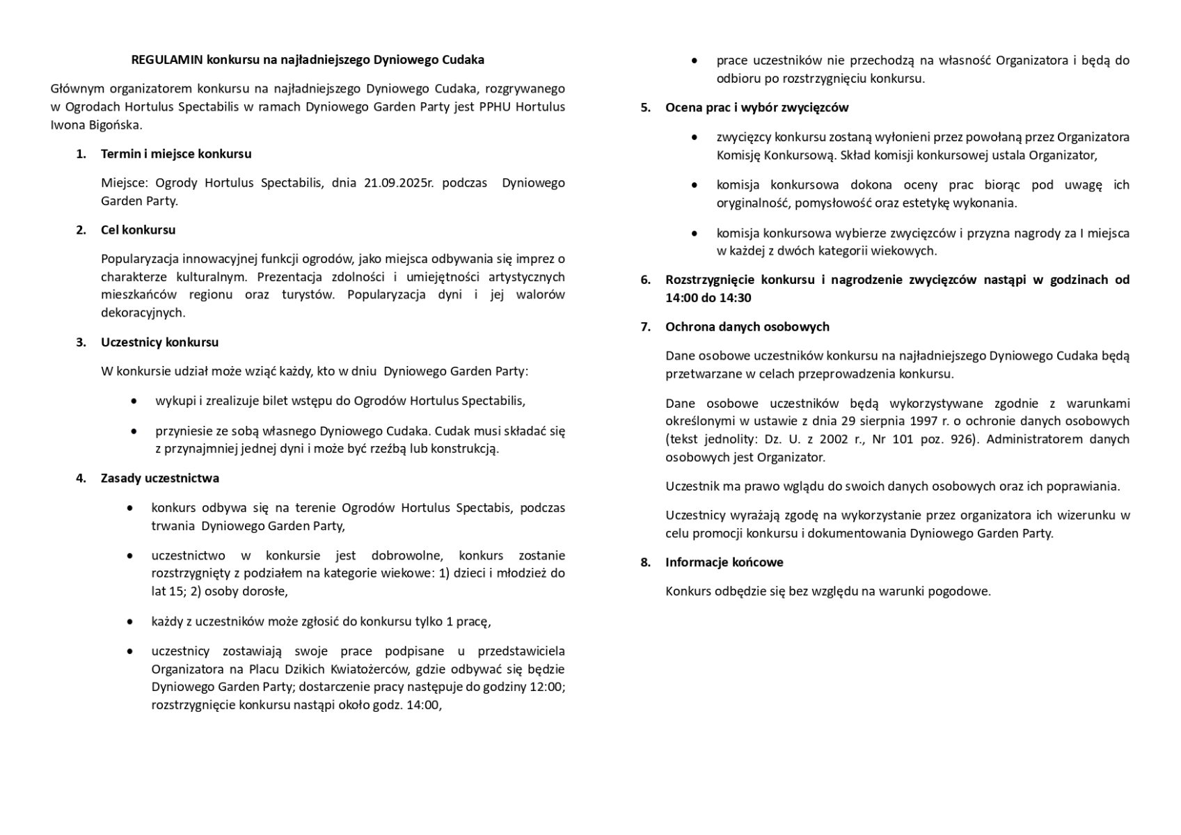 W konkursie może uczestniczyć każdy, kto w dniu wydarzenia odwiedzi Ogrody Hortulus Spectabilis i przyniesie ze sobą gotowego Dyniowego Cudaka. Warunek jest jeden – w pracy musi pojawić się przynajmniej jedna dynia. Może to być rzeźba albo fantazyjna konstrukcja – wszystko zależy od wyobraźni twórcy.